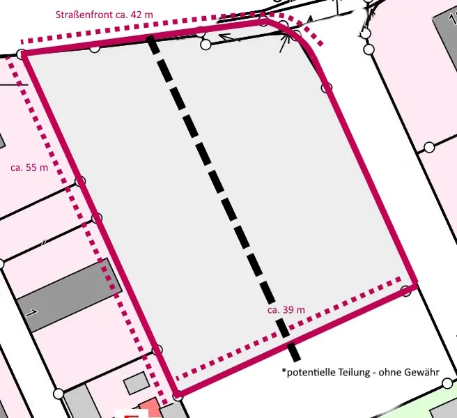 Bitte geben Sie Ihre komplette Adresse bei einer Anfrage an - damit wir Ihnen das Exposé schicken können. Das Grundstück umfasst derzeit eine Gesamtfläche von ca. 1.890 m². Es wird zur Teilung angeboten, sodass eine Veräußerung auch in geteilten Flächen möglich ist. Geplant ist eine gleichmäßige Aufteilung in etwa zwei gleich große Grundstücke. Die genaue Größe der Teilflächen steht noch nicht fest, da eine Vermessung durch das zuständige Vermessungsamt noch erfolgen muss. Das Grundstück liegt innerhalb eines durch einen Bebauungsplan geregelten Bereichs und unterliegt somit den Festsetzungen des § 30 BauGB. Das Areal bietet ein beachtliches Entwicklungspotenzial und eröffnet vielfältige Möglichkeiten für eine zeitgemäße Wohnbebauung – je nach Projektidee und Investitionsstrategie. Realisierbar wäre unter anderem die Errichtung von einem großzügigen Einfamilienhaus. Auszug der Daten gemäß Bebauungsplan: GRZ: 0,4 GFZ: 0,8 Anzahl: Vollgeschosse max. II Art der baulichen Nutzung: WA Das Grundstück bietet somit ideale Voraussetzungen für Investoren, Projektentwickler oder Bauträger, die eine hochwertige und bedarfsgerechte Wohnbebauung realisieren möchten. Wenn Sie Fragen zu der Bebauung oder zum Grundstück respektive zur Teilung haben, melden Sie sich gerne bei uns - wir freuen uns von Ihnen zu hören!