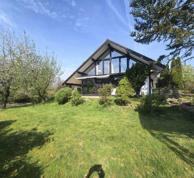 Bitte geben Sie Ihre komplette Adresse bei einer Anfrage an - damit wir Ihnen das Exposé schicken können. Fachwerk und viel Glas! Willkommen in einem außergewöhnlichen Zuhause, einem original DAVINCI Haus. Wenn Sie heute ein solches Haus bauen lassen würden, kostete es ohne Grundstück und ohne Garage ca. 1 Mio. Dieses architektonisch besondere Einfamilienhaus wurde 1990 auf einem traumhaften Grundstück mit 1.222 m² realisiert und bietet eine Wohnfläche von ca. 184 m² verteilt auf zwei lichtdurchflutete Ebenen. Vor dem Haus lädt ein liebevoll gestalteter Teich mit Springbrunnen und kleiner Holzbrücke dazu ein, jeden Tag mit einem Lächeln zu beginnen. Umgeben von gepflegtem Grün, alten Bäumen und einem geschmackvoll angelegten Garten bietet dieses Haus einen Rückzugsort für Naturliebhaber und Ästheten gleichermaßen. Im Erdgeschoss beeindruckt der großzügige offene Wohn-, Ess- und Kochbereich mit herrlichem Blick ins Grüne, dank der für DAVINCI typischen großflächigen Glasfronten wird, die Natur zum Teil des Wohnraums. Die Küche ist mit einem separaten Abstellraum ausgestattet und lädt zum gemeinsamen Kochen und Genießen ein. Zusätzlich stehen hier ein Schlafzimmer, ein Büro sowie ein Duschbad zur Verfügung ideal auch für komfortables Wohnen im Alter. Im Obergeschoss erwartet Sie das charakteristische DAVINCI Raumgefühl: zwei offene Galerien, die sich perfekt als Lese- oder Arbeitsbereiche eignen, zwei weitere Schlafzimmer, ein großzügiges Badezimmer mit Tageslicht sowie ein kleiner Ankleidebereich. Die Raumaufteilung ist durchdacht, offen und dennoch wohnlich eine gelungene Balance aus Design und Funktion. Technisch ist das Haus gut aufgestellt: Es verfügt über eine moderne Gas-Brennwertheizung (neuwertig) sowie Fußbodenheizung für ein angenehmes Wohnklima zu jeder Jahreszeit. Ein zusätzlicher Kamin im Wohnzimmer rundet das Angebot ab. Die Immobilie befindet sich in einem guten Zustand. Eventuelle Renovierungsarbeiten können ganz nach Ihren eigenen Vorstellungen und Stilwünschen realisiert werden. Die perfekte Basis für individuelles Wohnen auf hohem Niveau. Abgerundet wird das Angebot durch eine großzügige Doppelgarage sowie ein überdachtes Wohnmobil-Carport ideal für alle, die Platz für Fahrzeuge, Hobbys oder zusätzlichen Stauraum benötigen.
