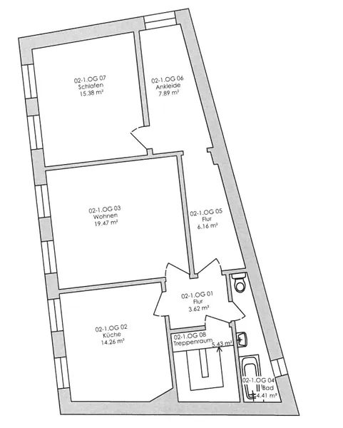 Die Wohnung verfügt über eine Fläche von ca. 70 m² und ist aufgeteilt in eine großzügige Küche, Wohnzimmer, Schlafzimmer und einem kleinen Durchgangszimmer, das als Arbeitszimmer genutzt werden kann. Der Holzboden sorgt für eine wohnliche Atmosphäre. Das Tageslichbad verfügt über eine Badewanne. Die Wohnung wird über eine Gas-Etagenheizung beheizt