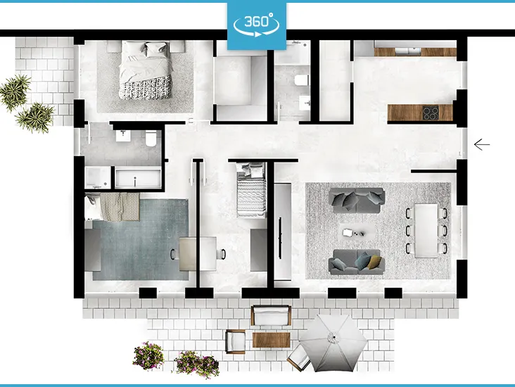 Erleben Sie die Vorteile einer Parterrewohnung mit privatem Eingang, viel Raum für Sie und Ihre Kinder auf Ihrer riesigen Terrasse. Genießen Sie auf der Südseite des Lebens Ihren einmaligen Außenbereich. Der mühelose und barrierefreie Zugang macht es bequem für jung und alt Ihre Wohnung auch von der Tiefgarage zu betreten. Das Herzstück der Wohnung bildet das moderne Wohnzimmer mit halboffener Küche. Hier lassen sich gemütliche und entspannte Abende mit der Familie oder Freunden verbringen. Der großzügig gestaltete Küchenbereich lädt zum gemeinsamen Kochen mit Freunden und der Familie ein. Jedes der 4 Zimmer verfügt über direkten Zugang zur Terrasse. Die Eltern residieren im ganz privaten Bereich mit eigenem Ankleidezimmer, Bad mit Wanne und Dusche und eigener Terrasse. Die Kinder kommen mit eigenem Kinderbad dabei nicht zu kurz. Die Wohnung ist bereits inkl. hochwertigen Bodenbelägen und Tapezierarbeiten bezugsfertig für Sie eingerichtet. Zu jeder Wohnung gehört ein Tiefgaragenstellplatz, welcher für 15.000,00 EUR erworben werden kann. Ganz gleich was Sie erwarten, es übertrifft Ihr Vorstellungsvermögen. Lassen Sie sich inspirieren und richten Sie sich jetzt schon in diese bezugsfertige Luxuswohnung ein. Live mit uns, oder gemütlich von daheim am PC: Für diese Immobilie bieten wir Ihnen eine Onlinebesichtigung in 360 Grad an.
