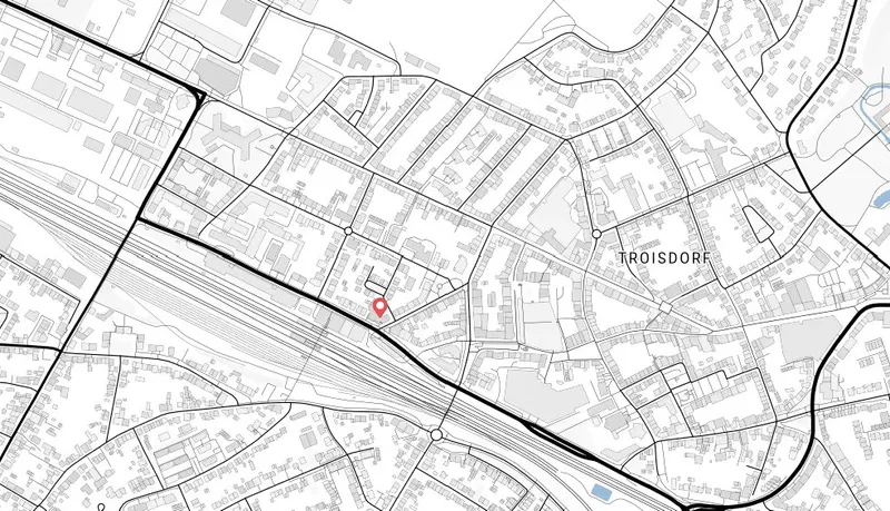 Das Objekt befindet sich in zentraler Lage von Troisdorf und bietet eine hervorragende Verkehrsanbindung für Kunden, Mitarbeiter und Geschäftspartner. Der Bahnhof ist fußläufig erreichbar und ermöglicht eine schnelle ÖPNV-Verbindung nach Köln, Bonn und Siegburg. Darüber hinaus ist der Standort verkehrstechnisch sehr gut erschlossen: Hauptverkehrsstraßen wie die B8 und B56 sind in wenigen Minuten erreichbar und bieten direkten Anschluss an die Autobahnen A59 und A3. So ist auch der überregionale Straßenverkehr problemlos zugänglich. Insgesamt überzeugt der Standort durch seine zentrale Lage, sehr gute Erreichbarkeit und Sichtbarkeit – ideale Voraussetzungen für eine gewerbliche Nutzung.