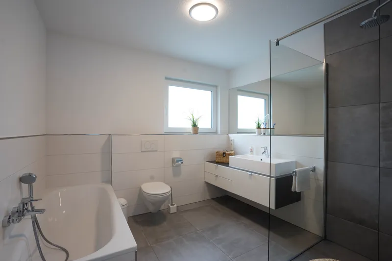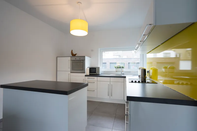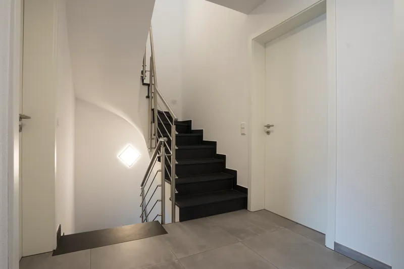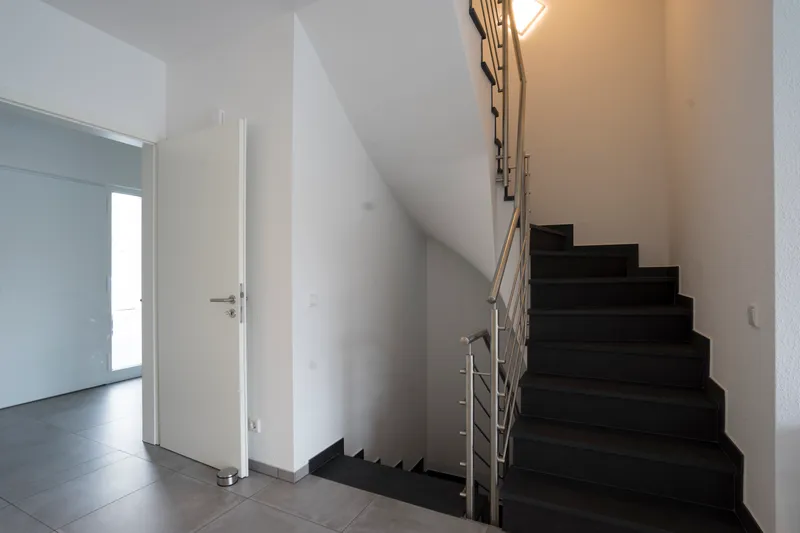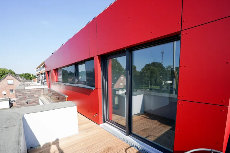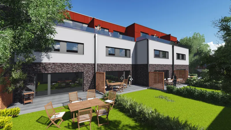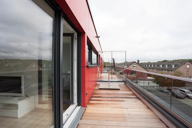 Sicherlich werden Sie so einige Highlights in dieser Neubau-Immobilie finden, der Penthouse-Bereich ist jedoch einfach der Knaller. Aber dazu später mehr. Fangen wir mit der Visitenkarte der Immobilie an - der Fassade und der Architektur. Hier prägen architektonische Linien und eine durchdachte und moderne Fassadengestaltung das Bild. Mit der Kombination aus einer massiven Klinkerfassade, der aufgelockerten Putzfassade und den farbigen Platten im Penthouse-Bereich wirkt das Gebäude wie ein Kunstwerk. Verteilt auf 4 Ebenen stehen Ihrer Familie neben den 147m² Wohnfläche, zusätzliche 51m² Nutzfläche im Kellergeschoss. Im Keller, hergestellt aus einer wasserundurchlässigen Stahlbetonkonstruktion, finden Sie neben dem Hauswirtschaftsraum, 2 weitere Räume für Ihre Hobbys. Neben dem großzügigen Wohn-, Koch- und Essbereich mit einem Gäste-WC im Erdgeschoss, verfügen Sie über 3 Schlafräume im Obergeschoss mit einem voll ausgestatteten Luxusbad und zusätzlichem Abstellraum. Zu meinem persönlichen Highlight kommen wir eine Etage höher. Hier entsteht ein Wohnparadies für Ihr Kind, den Beruf oder Ihr Hobby. Ein großes Schlafzimmer mit eigener Ankleide und eigenem Bad mit Dusche wird Sie begeistern. Als ob das nicht ausreicht, verfügt diese Ebene über einen eigenen Balkon auf der einen Seite des Hauses und einer Dachterrasse auf der anderen Seite.